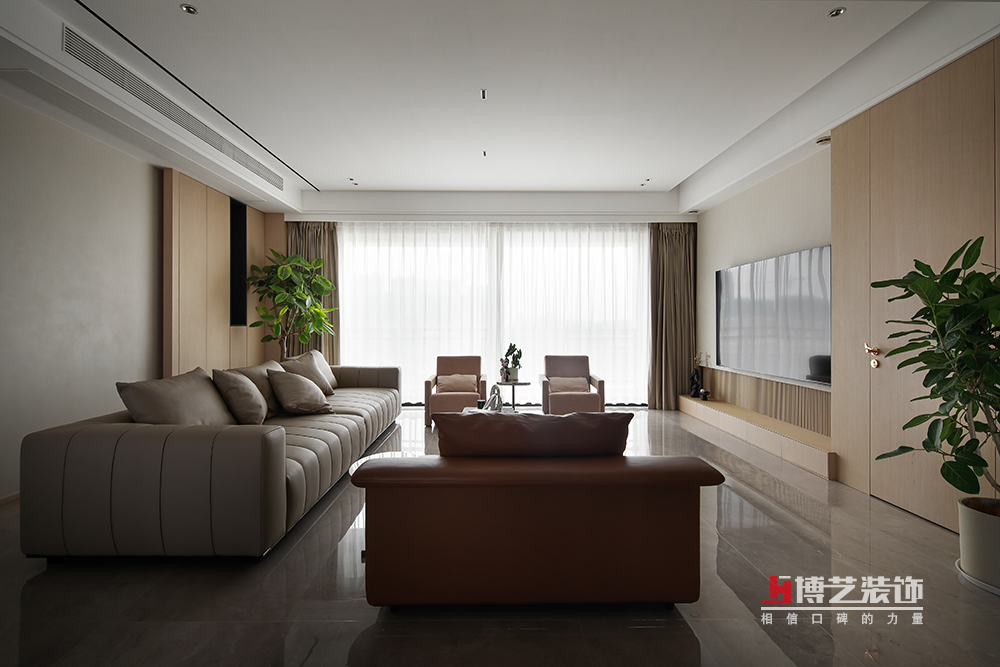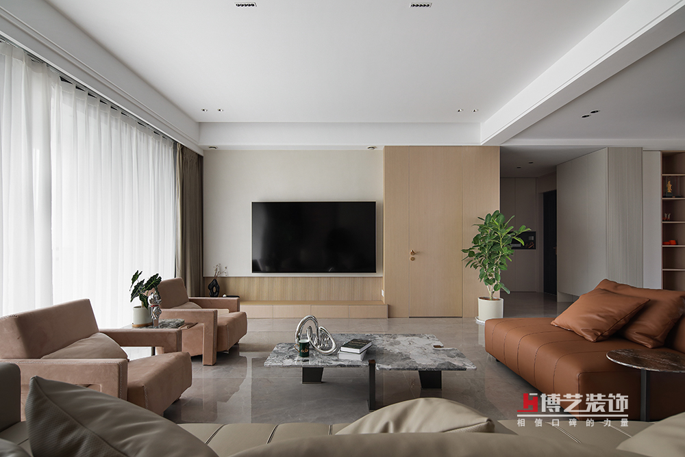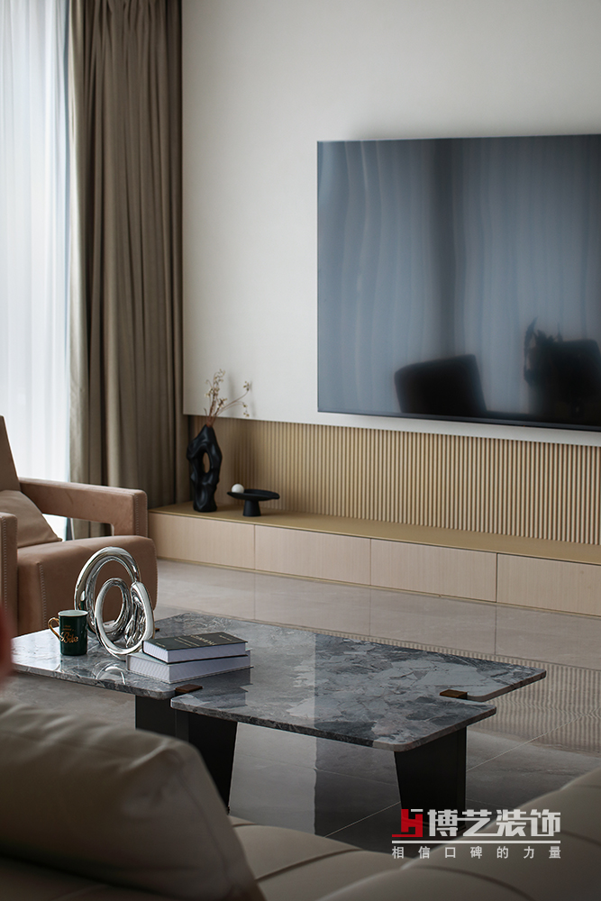 電視背景墻與沙發背景遙相呼應,用隱形門的設計讓背景獨立完整。在這個忙碌的快節奏生活里,選一個落日黃昏,攜一縷清風入茶,會兩三好友,也是人生一大樂事。
