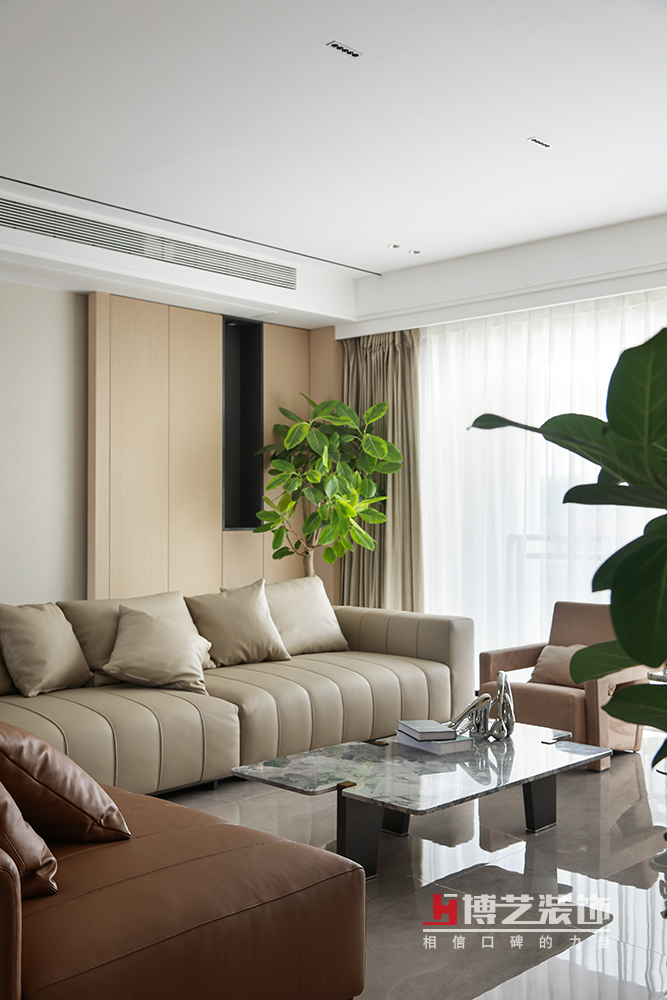 沙發的選擇由米白到米黃到杏黃分層過渡,同色系之間繁而不亂,跳脫而又和諧。皮質到絨布,各種材質的碰撞,硬朗中包裹著柔和。