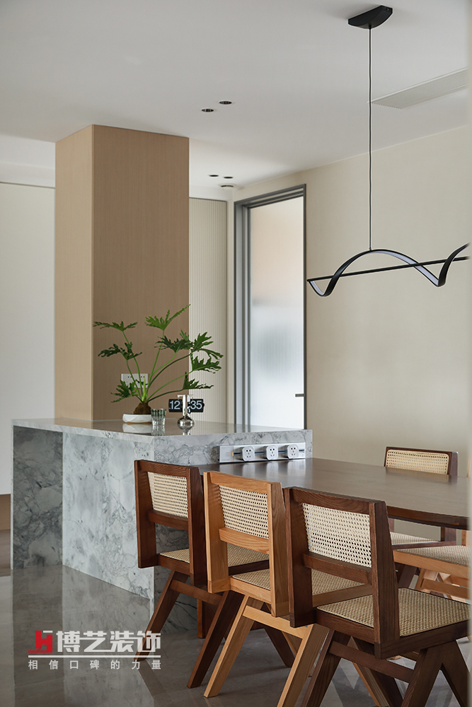 大理石的導臺和木質的餐桌,兩種不同色系和不同材質的碰撞,加上網紅昌迪加爾椅,讓整個餐廳蒙上濃濃的中古氣息。