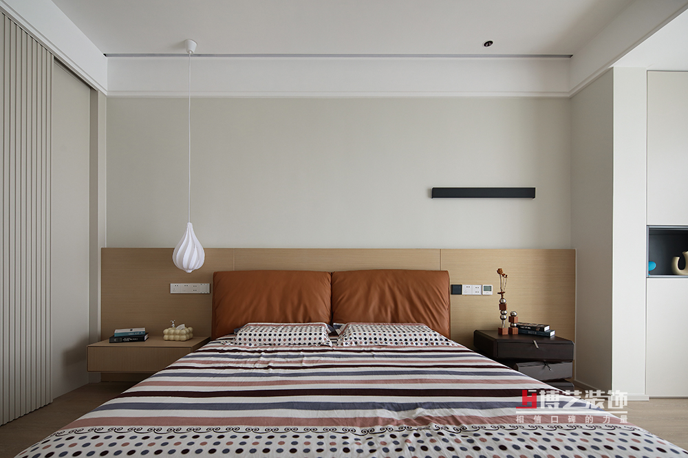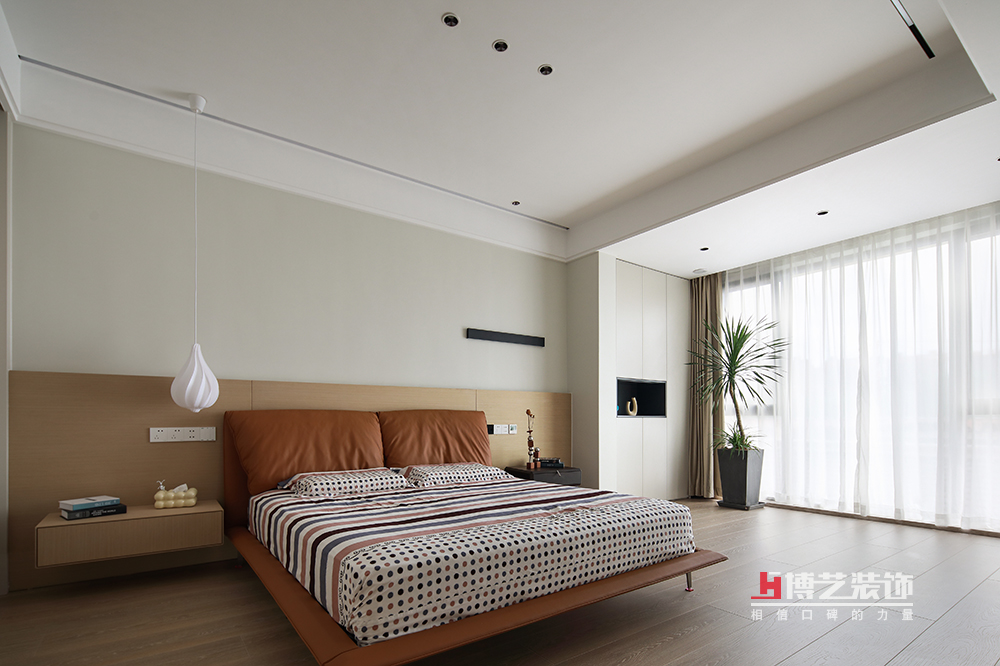 主臥是延續了客餐廳的色系,使得整個家居風格渾然一體。打通了陽臺,迎接我們的是明朗的陽光和開闊的視野,同時大面積的采光,為房間帶來怡人的自然光影,主臥用自己傾聽者的姿態包容主人的喜怒哀樂,讓主人汲取滿滿能量。