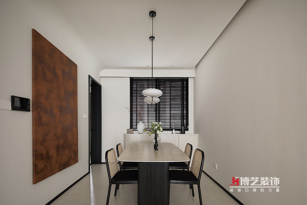 兩盞圓形吊燈,一張方形餐桌,自古“天圓地方”的設計理念在餐廳得到了很好的展現。黃褐色的大幅裝飾畫,又給餐廳黑白空間中注入了一劑更堅定柔和的力量,讓餐廳空間的色彩不至于單調。