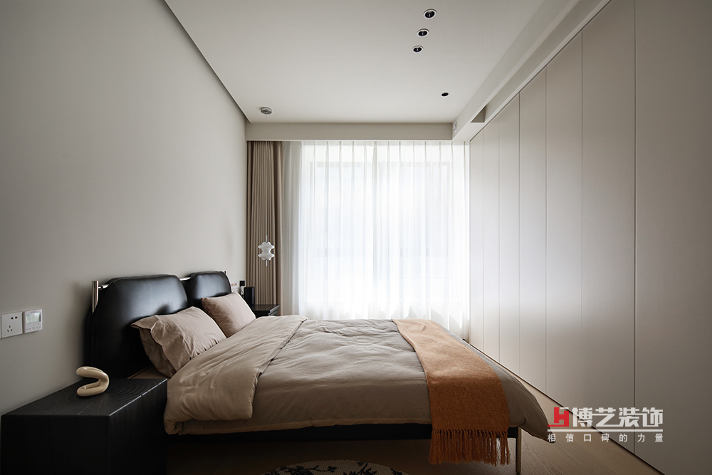 主臥將簡約風做到了極致,整墻的按壓式儲物柜,不同于拉手式衣櫥,讓柜體更隱形,視覺上增加空間感。簡易的撞色桌椅,在恬靜的空間中雜糅一抹動感紅棕,讓整個臥室環境更具層次。